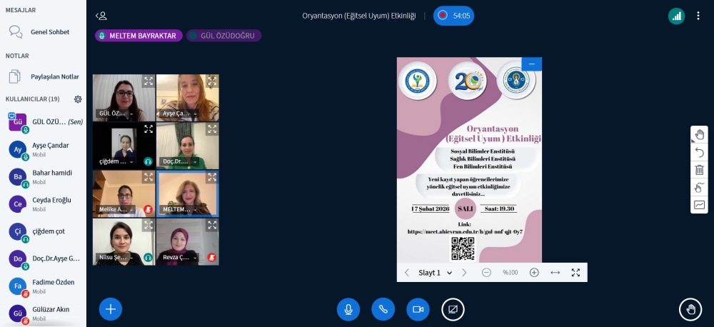 17 Şubat Salı 19:30’da 2025-2026 eğitim-öğretim yılı bahar döneminde kayıt yaptıran öğrencilerimize yönelik oryantasyon (eğitsel uyum) etkinliği çevrimiçi ortamda gerçekleştirildi. Etkinlikte web sitesi, mevzuat, akademik takvim, ders ve tez süreçleri, AYDEP, memnuniyet yönetim sistemi, dokümantasyon, sosyal transkript, lisansüstü öğrenci topluluğu ve sosyal medya hesapları gibi konularda bilgilendirme yapıldı. Soru-cevap bölümünün ardından etkinlik sonlandırıldı.